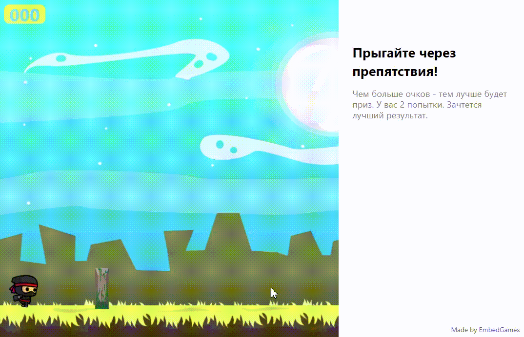 Игра на умение. Игрок перепрыгивает через препятствия. Чем больше он наберет очков — тем ценнее выиграет приз.